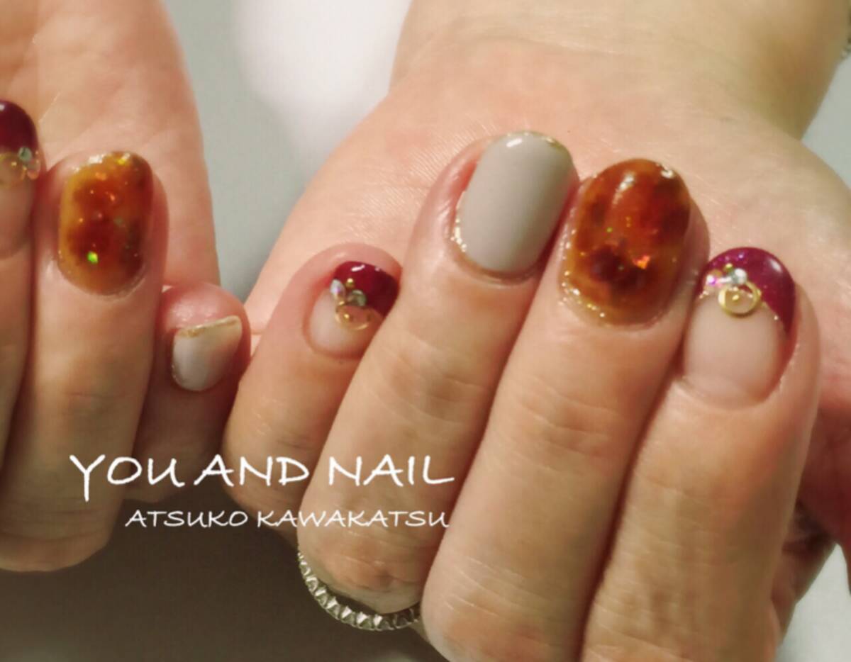 べっ甲とスモーキーカラーの秋ネイル 高津区溝の口長持ちジェルで自爪にやさしいネイルサロンエコモマイ