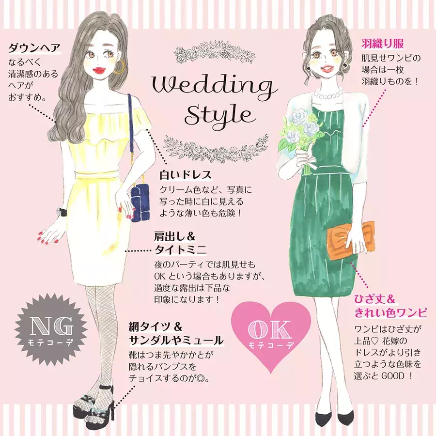 結婚式に招かれた場合は、肩出しのファッションは避けるのが基本です。 そもそもチャペルや神社の神聖な場所で、肌の露出が多い服装はしてはいけません。 元々は教会での結婚式 ゲスト キホン 結婚式にお呼ばれしたら、楽しみでもあり悩みのタネでもあるのが服装ではないでしょうか。 男性・女性それぞれの結婚式での服装マナーやNGポイント